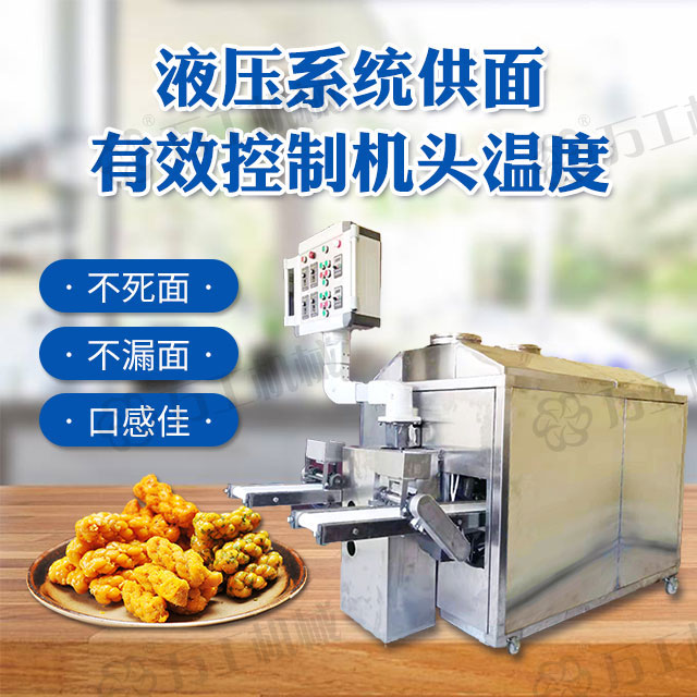 ①自動化系統。採用自動化技術:機械、液壓、電器、電子綜合自動化控制技術,最大限度地節省瞭人力。油缸進退、壓面速度、扭股成條、麻花長短控制(截條)、成品堆放收集,都實現瞭自動化。整個機器隻需要一人即可操作。